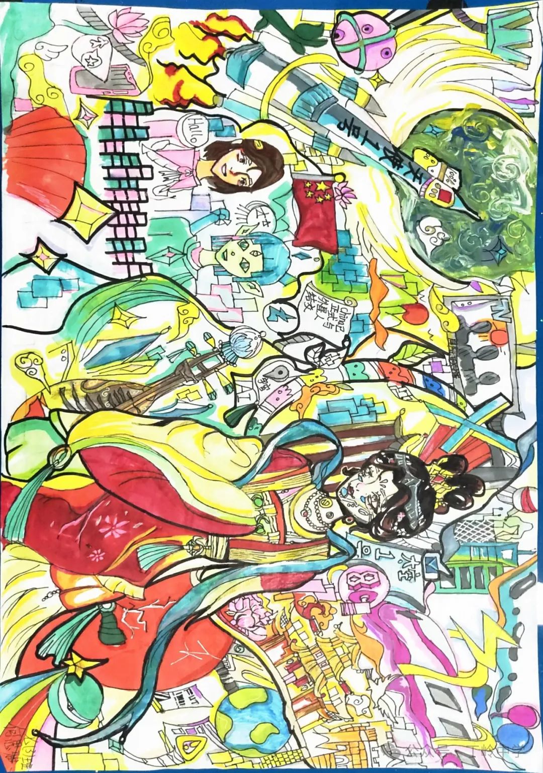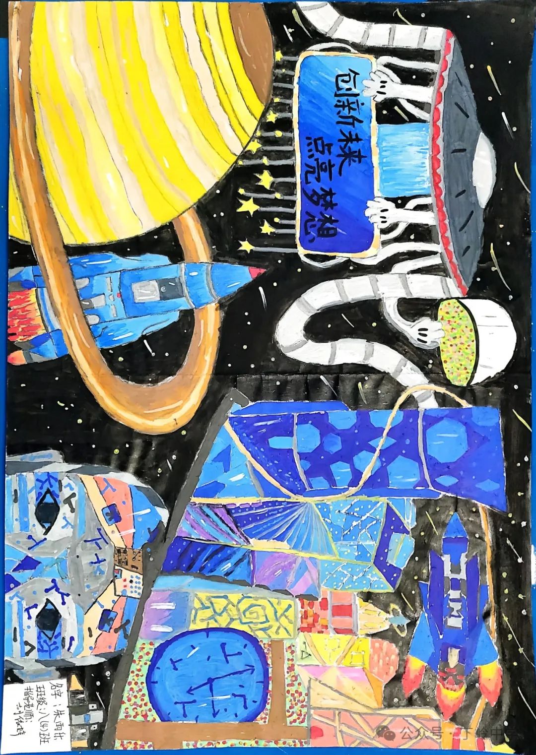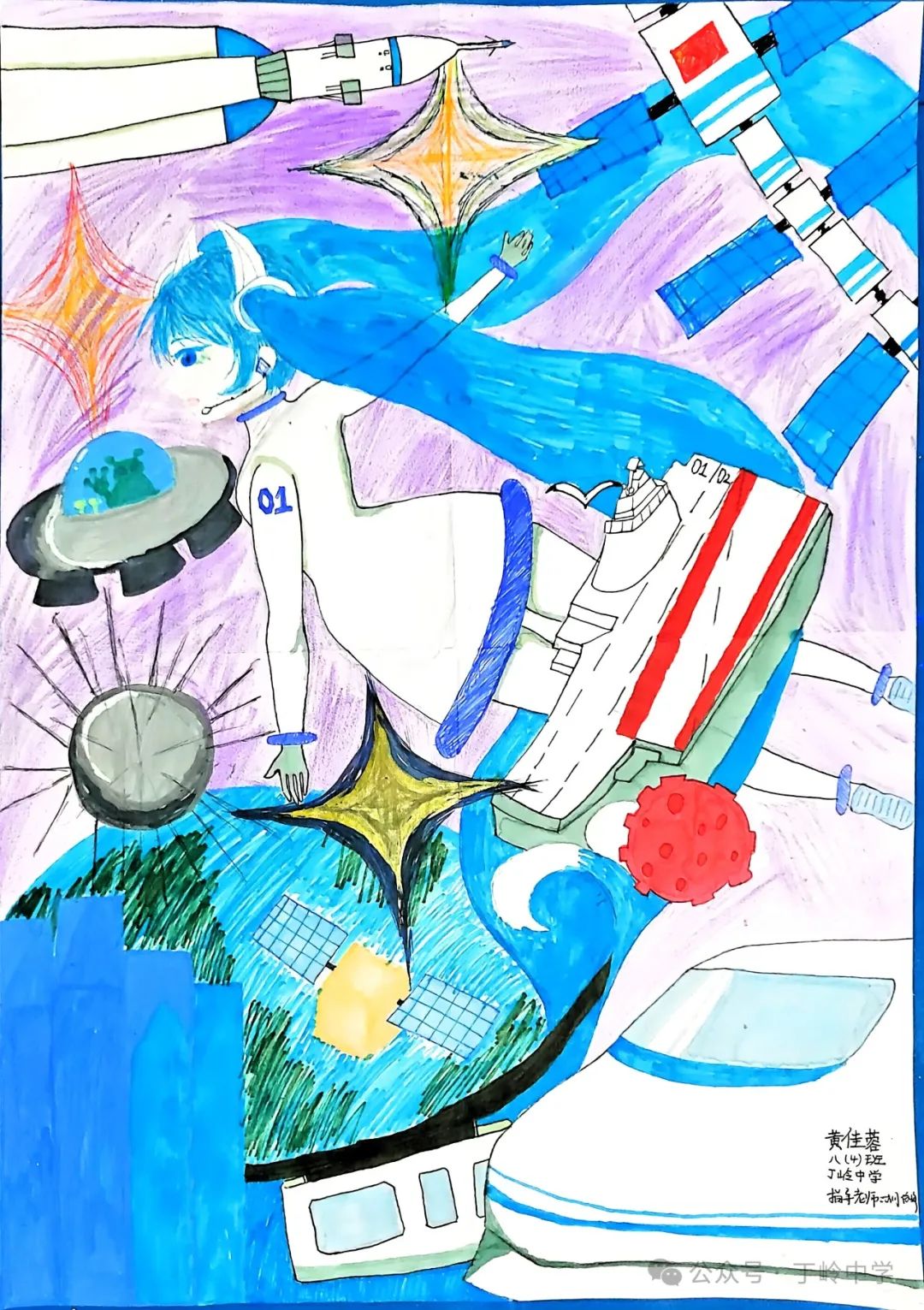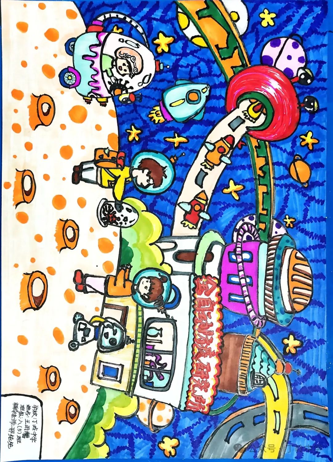 同学们化身 “未来设计师”,以笔为桨、以梦为帆,在画布上展开奇幻遨游 —— 有人用荧光笔触勾勒星际移民的生态城邦,有人以细腻线条编织人工智能与自然共生的美好图景,更有人将各种前沿概念转化为可视化的艺术语言。每一幅作品都是思维火花的具象化呈现,既承载着对现有科技的深度思考,更流淌着对未来世界的大胆构想,科技的冷峻与艺术的温暖此刻在画纸上达成奇妙共振!