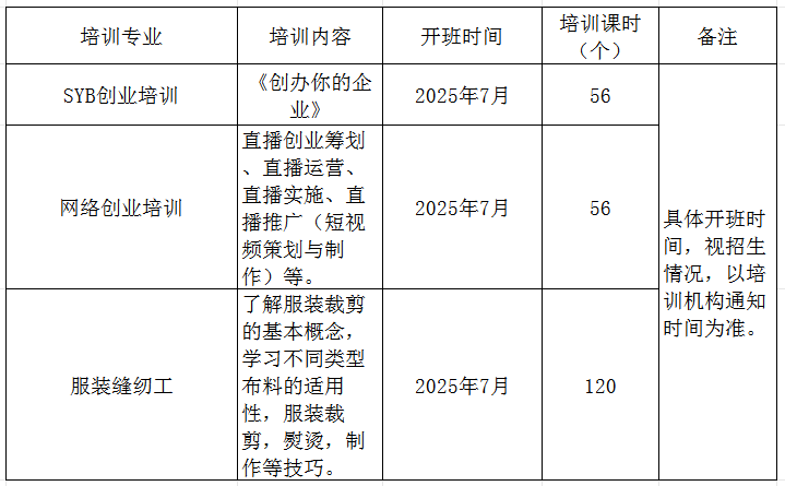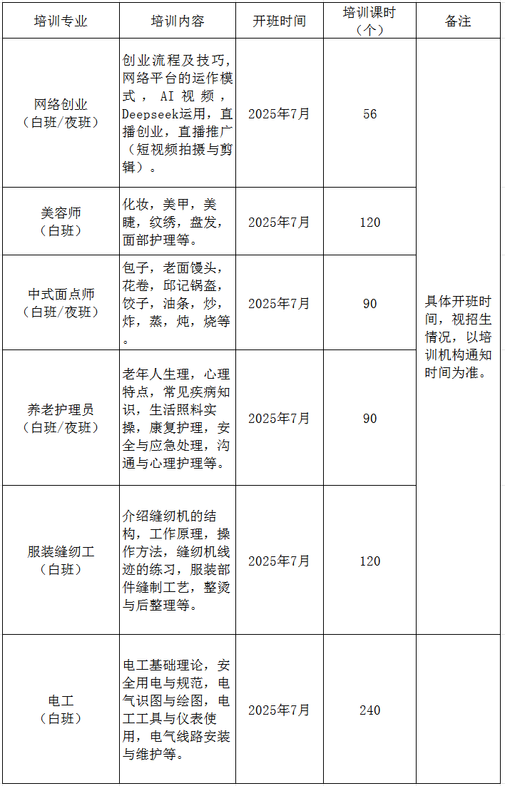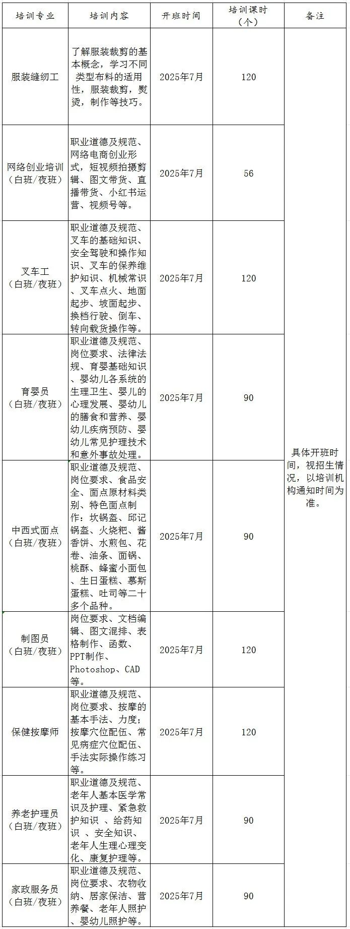 为深入贯彻落实“技能照亮前程”培训行动,提升城乡劳动者就业技能,促进高质量就业,现将潜江市2025年7月份补贴性就业创业培训开班信息予以公布。培训专业主要有叉车工、制图员、育婴员、服装缝纫工、养老护理员、中西式面点、SYB创业培训、网络创业培训等,请符合培训条件以及有培训愿望的城乡劳动者踊跃报名参加。