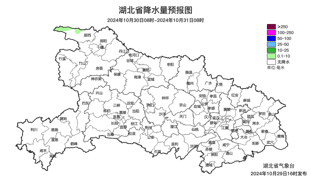 30日08时-31日08时,全省晴天间多云,其中十堰局地有短时小雨。最高气温21~25℃,最低气温11~14℃,偏北风2到3级转3到4级。