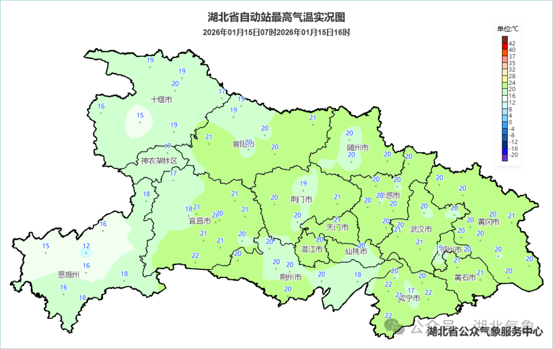 1月16日08时-17日08时,鄂西南南部、江汉平原南部阴天有小雨;鄂东南多云到阴天,晚上转小雨;其他地区多云。最高气温中西部17~20℃、东部20~23℃,最低气温鄂西北-2~2℃、其他地区3~8℃,偏北风2到3级转3到4级。