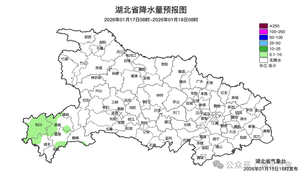 1月17日08时-18日08时,鄂西南零星小雨转阴天;其他地区阴天到多云。最高气温中西部8~12℃、东部12~16℃,最低气温鄂西北-2~2℃、其他地区3~8℃,偏北风3到4级转2到3级。