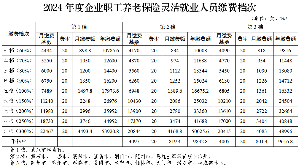 第1档:武汉市和省直,社会保险缴费基数月标准为7489元,个人缴费基数上限为22467元,个人缴费基数下限4494元;