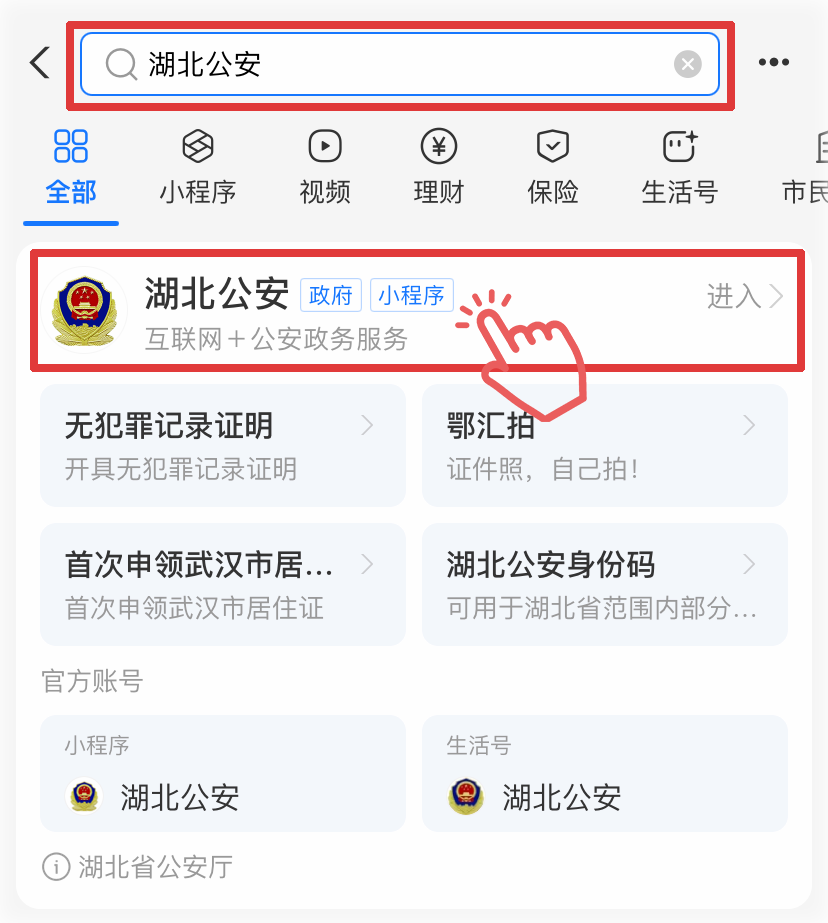 支付宝搜索“湖北公安”,进入湖北公安小程序。