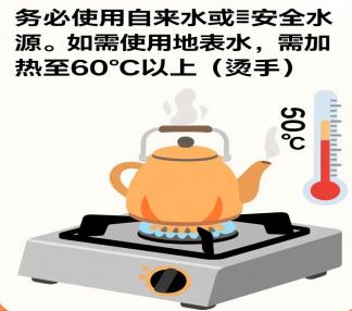 ·安全用水:生活用水务必使用自来水或安全水源。如需使用地表水,必须存储3天以上,或加热至60℃以上(烫手),或按照说明加漂白粉后方可使用。
