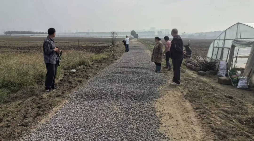 为严把质量关,由党员和农户代表组成的“民主监督小组”每日巡查工地,查验碎石厚度、水泥标号与路面平整度,发现问题现场提出,以群众监工筑牢质量防线。目前,工程正有序推进,3900米碎石路段已大部分完工,农机通行平稳性显著提升;800米硬化路段的路基铺设也正在启动中。