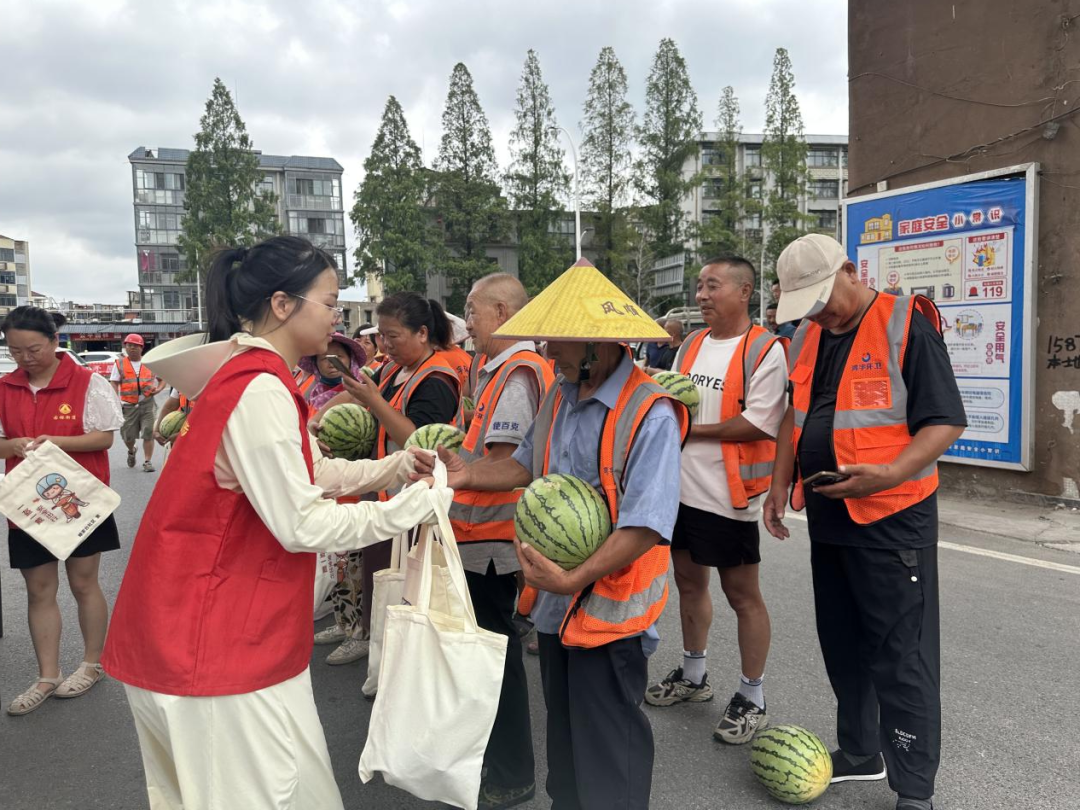 社区志愿者们早早备好矿泉水、绿豆汤、西瓜等消暑物资,为刚结束早班清扫的环卫工人送上清凉慰问。“天气炎热,大家在街头忙碌实在辛苦!这些消暑物资希望能帮着降降温,一定要多喝水、适时休息。”社区负责人一边递上消暑物资,一边叮嘱工人们注意防暑降温。李师傅捧着西瓜感动地说:“这些解暑物品来得太及时了,感谢社区的关心!”