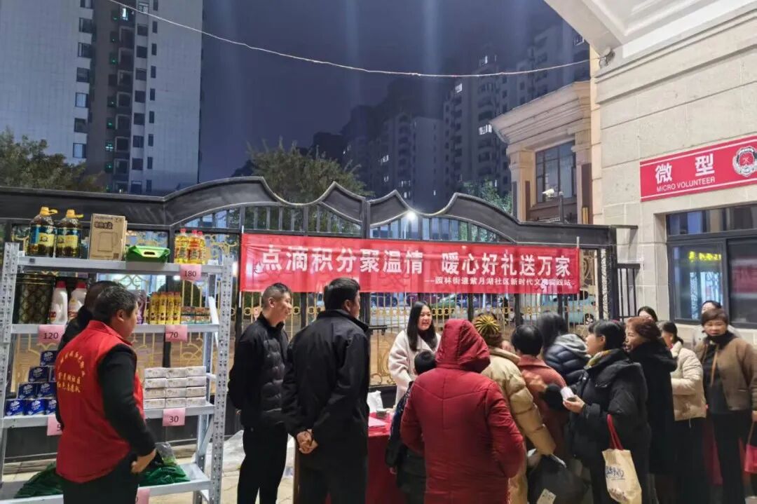 12月19日晚,紫月湖社区联合市城管局下沉工作队及金碧物业,在恒大名都小区开展志愿服务积分兑换活动。