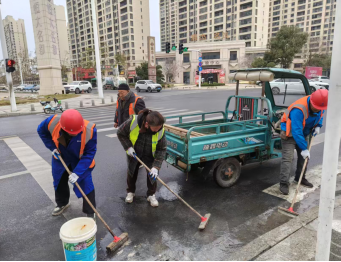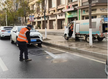 在群英路恒大小区路段,“党员突击队”与环卫工人迅速投入战斗。针对沿街商户门前的顽固油污,队员们手持高压水枪搭配专用清洁剂,逐寸冲刷清洗;有的俯身用铁锹铲除砖缝内的黑垢与杂草,有的徒手清理树池里缠绕树根的塑料袋与砖石。主干道及小区周边,机械洗扫车高效作业;人行道与店铺台阶前,人工精细化清扫泥沙、烟头、落叶等。党员干部沾满灰尘的双手干劲十足,橙色环卫服在初冬的阳光下格外亮眼。经过数小时奋战,油污斑驳的地面重现本色,树池垃圾彻底清零,整条道路焕然一新。