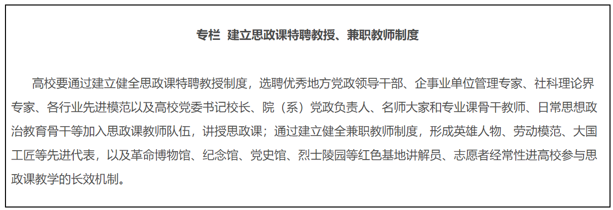 14.建设专兼结合的师资队伍。各地各校严格按照要求配备建强高校专职思政课教师、辅导员队伍,提高中小学专职思政课教师比例,实行思政课特聘教授、兼职教师制度,积极聘请党政领导、科学家、老同志、先进模范等担任思政课兼职教师。深入实施马克思主义学院院长(书记)培养工程,通过集中培养培训、委托重大项目、加强实践锻炼、开展国际国内访学等方式,培养一批青年马克思主义理论家。