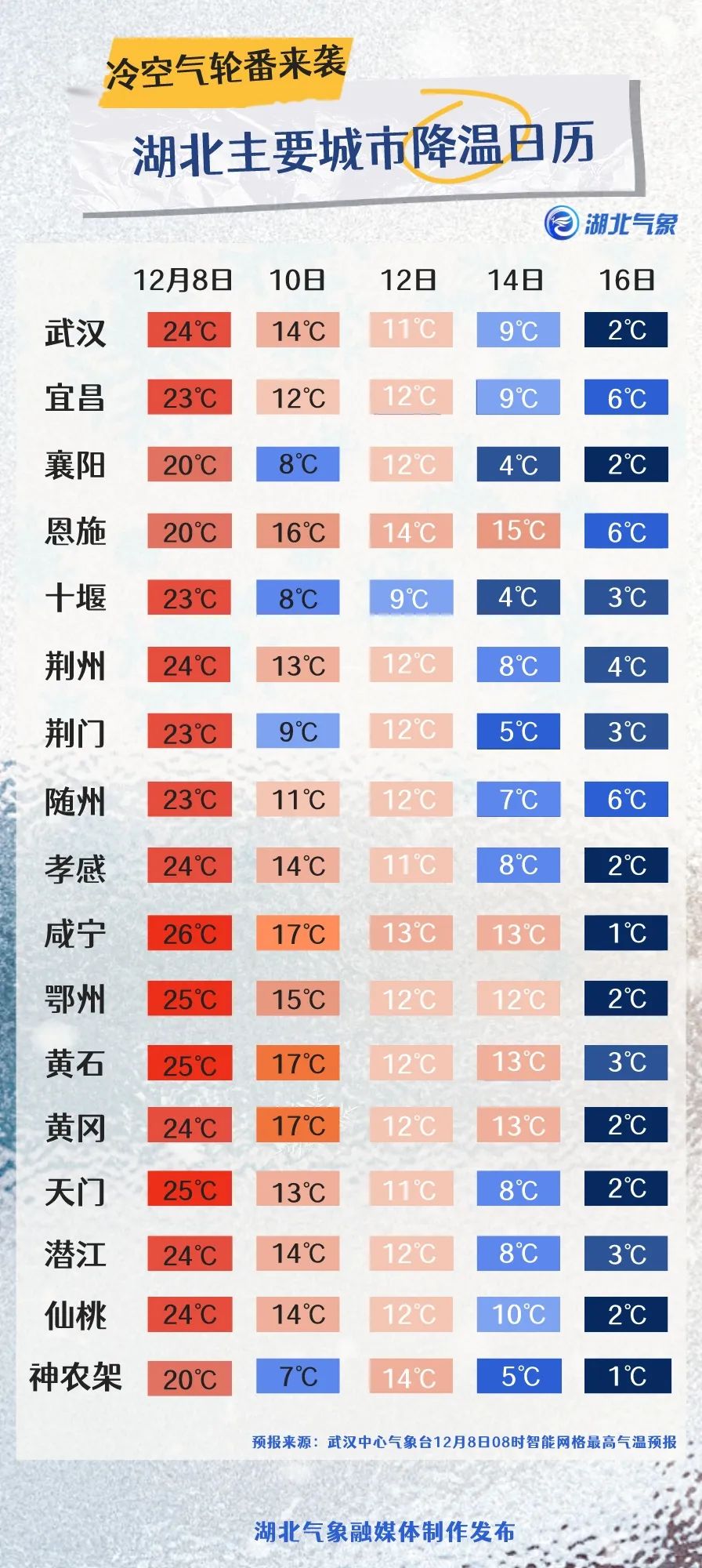 10-11日冷空气影响。明天开始,随着我省转阴雨天气,气温下降,大部地区高温降至17~21℃。后天在冷空气影响下,鄂西北最高气温迅速跌至10℃以内,我省将出现大范围寒潮天气。11日寒潮天气持续,大部高温降至5~10℃。预计这轮冷空气我省各地高温降幅达14~18℃。