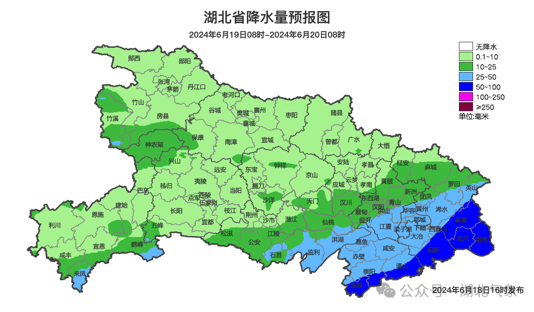 6月19日08时-20日08时,江汉平原东部、鄂东南阵雨转中到大雨,局地暴雨,并伴有短时强降水、雷暴大风等强对流天气;鄂西北多云有阵雨或雷阵雨;其他地区阴天有小到中雨、局地大雨。最高气温西部31~33℃、东部27~31℃,最低气温22~26℃,偏东风2到3级。
