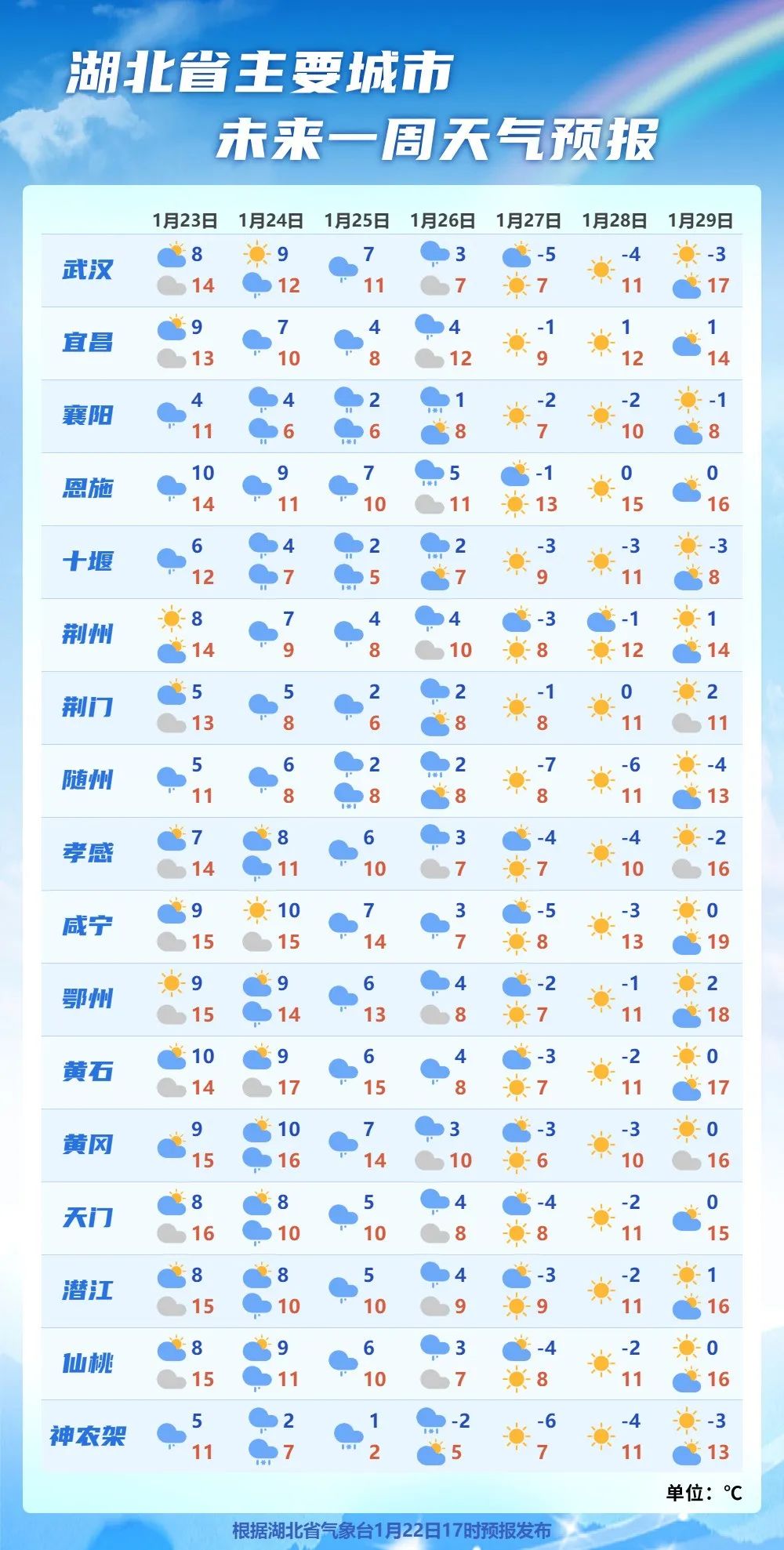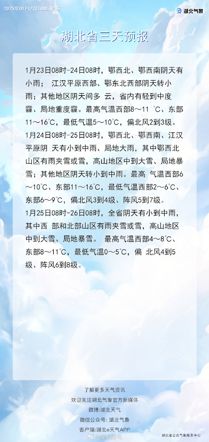 明天鄂西、江汉平原有小到中雨、局地大雨,其中鄂西北山区有雨夹雪或雪,高山地区中到大雪、局地暴雪,其他地区阴天转小到中雨。最高气温西部较今天有小幅下滑。后天雨雪范围扩大,全省有小到中雨,其中西部和北部山区有雨夹雪或雪,高山地区中到大雪、局地暴雪。高温继续下滑,省内大部跌至个位数。明后天偏北风强劲达6~9级。未来三天最低气温也是逐日下滑,后天省内多地仅0℃出头。