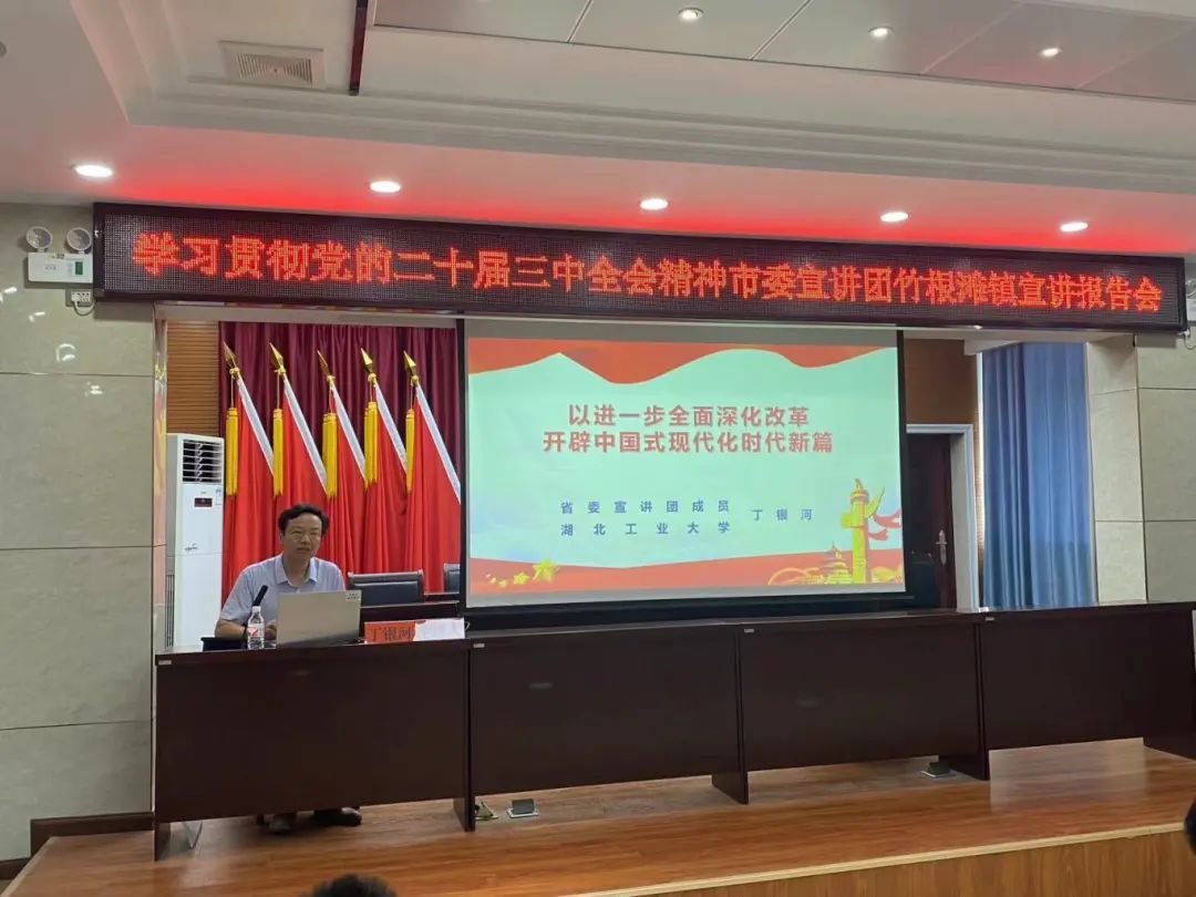 为全面深入学习领会党的二十届三中全会精神,扎实有序推进学习宣传贯彻工作。8月16日,学习贯彻党的二十届三中全会精神市委宣讲团宣讲报告会在竹根滩镇举行。湖北工业大学马克思主义学院院长、教授丁银河作宣讲报告。