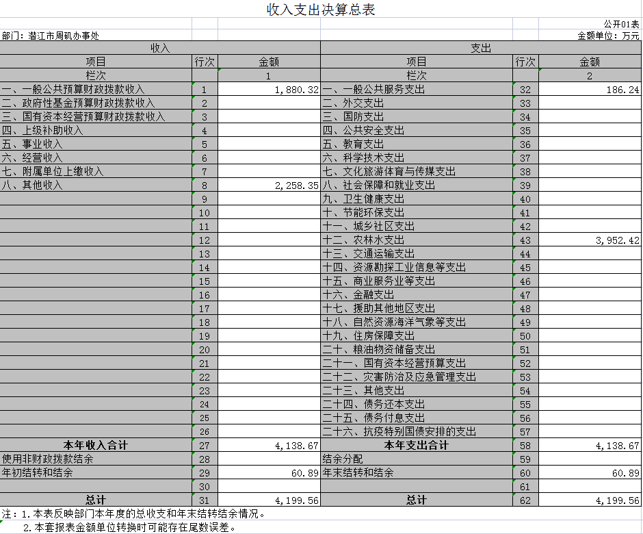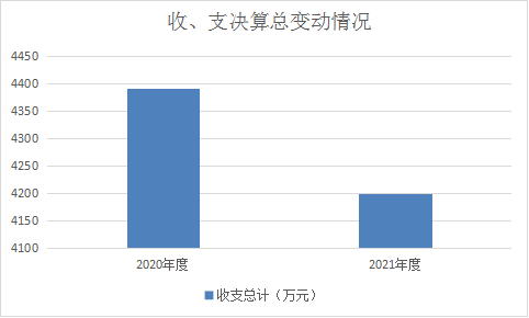 2021年度收、支总计均为4199.55万元。与2020年度相比,收、支总计各减少192.63万元,下降4.39 %,主要原因是缩减开支。