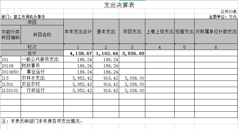 2021年度支出合计4138.67万元。其中:基本支出1102.66万元,占本年支出26.64%;项目支出3036.00万元,占本年支出73.36%;上缴上级支出0万元,占本年支出0%;经营支出0万元,占本年支出0%。本部门使用科目:一般公共服务支出-财政事务-事业运行、农林水支出-农业农村-行政运行。