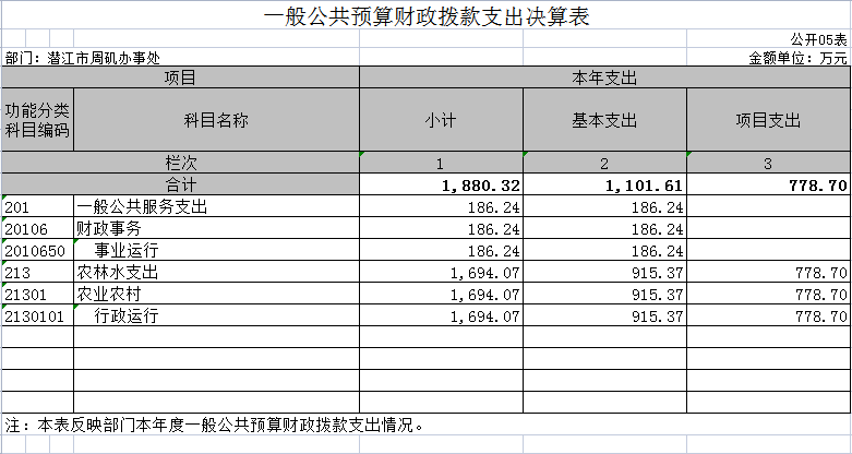 2021年度财政拨款支出1880.32万元,主要用于以下方面:一般公共服务(类)支出186.24万元,占9.90%;农林水支出1694.07万元,占90.10%。