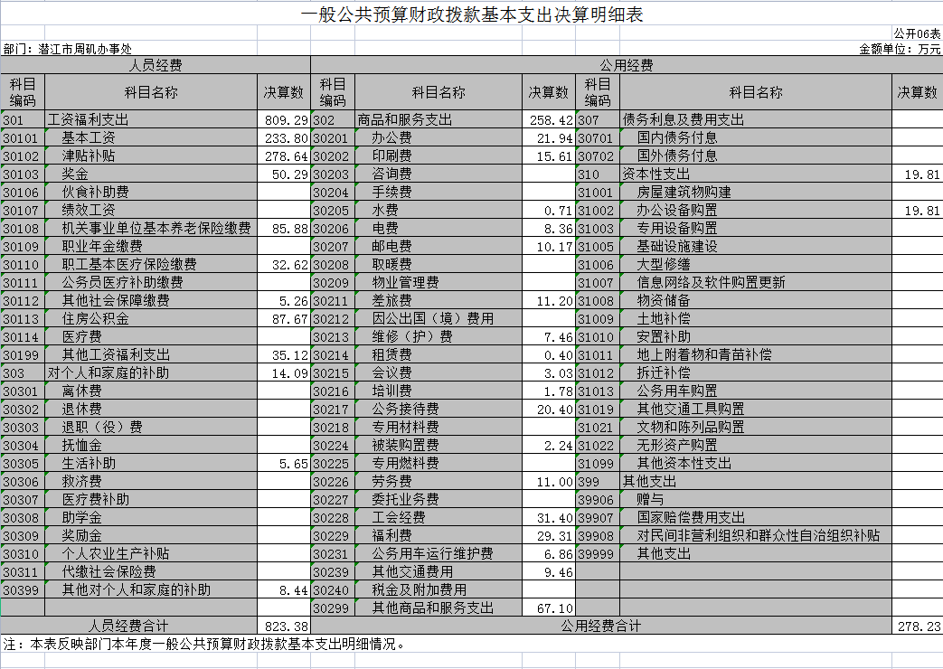 人员经费823.38万元,主要包括:基本工资、津贴补贴、奖金、机关事业单位基本养老保险缴费、职工基本医疗保险缴费、其他社会保障缴费、住房公积金、其他工资福利支出、生活补助、其他对个人和家庭的补助。