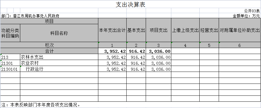 2.农林水支出。年初预算为1700.00万元,支出决算为1694.07万元,完成年初预算的99.65%,支出决算数小于年初预算数(凡是年中有追加预算的或决算数低于年初预算数95%的应作原因说明)的主要原因:缩减开支。