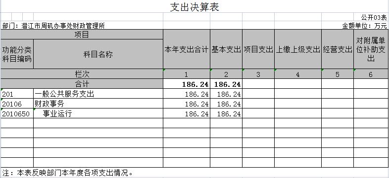 1.一般公共服务支出(类)。年初预算为188.00万元,支出决算为186.32万元,完成年初预算的99.11%,支出决算数小于年初预算数(凡是年中有追加预算的或决算数低于年初预算数95%的应作原因说明)的主要原因:缩减开支。