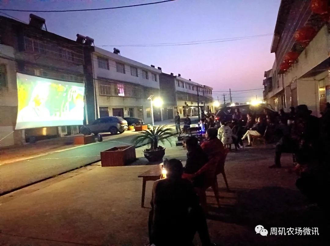 天色将晚,暮色渐浓,周矶管理区前进三队、十一队人头攒动、热闹非凡,大家聚在一块,一边谈论着最近生产队里发生的事儿,一边等待着影片播放。放映员熟练地张挂幕布、调试设备,认真做着准备工作。
