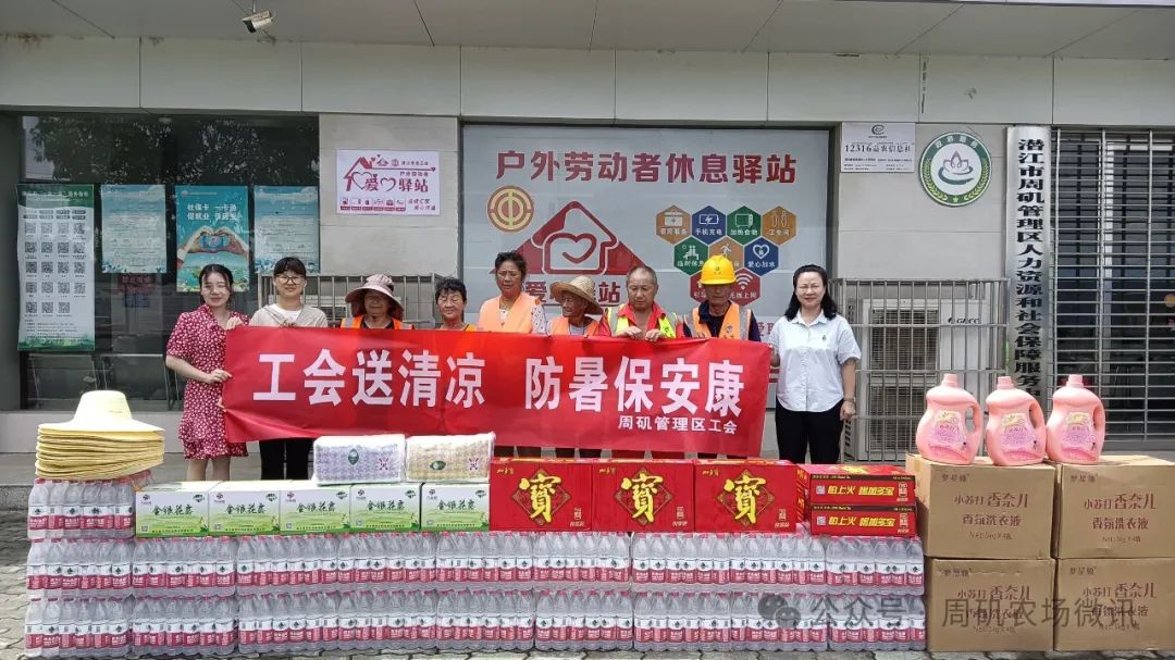 为做好一线职工的防暑降温工作,有效防控高温中暑事件和安全生产事故发生,切实维护广大职工的劳动安全和健康权益。7月29日,周矶管理区工会主席李勤梅一行为辖区内环卫工人、高温作业工人等送去了金银花露、加多宝凉茶、矿泉水、洗衣液、毛巾、草帽等防暑降温物品,在炎炎夏日为大家送上一缕清凉。