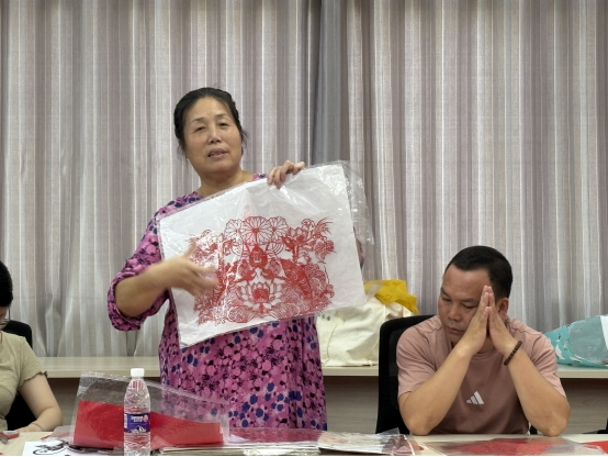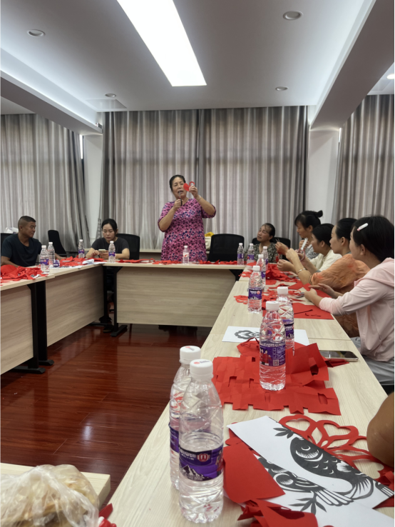 活动特别邀请了剪纸非遗传承人程东梅老师授课。活动开场,程老师先分享了七夕节的起源、牛郎织女的动人传说,以及各地独特的七夕习俗,让大家对这个传统节日有了更深入的了解。随后,程老师详细讲解了剪纸的基本技巧,如折叠方法、裁剪线条走向、图案设计思路等,并亲自示范,展示如何将一张普通红纸变成精美的剪纸作品。
