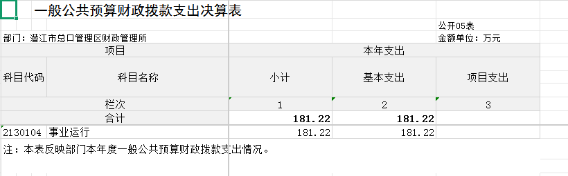 潜江市总口管理区财政管理所2024年度一般公共预算财政拨款支出181.22万元,主要用于以下方面:事业运行181.22万元,占100%。