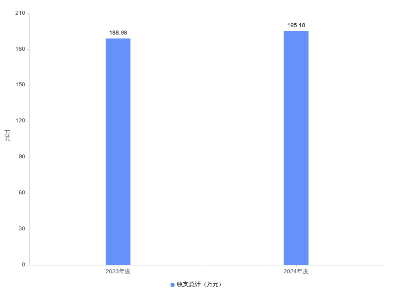 2024年度收、支总计均为195.18万元。与2023年度相比,收、支总计增加6.20万元,增长3.3%,主要原因是项目支出增加。