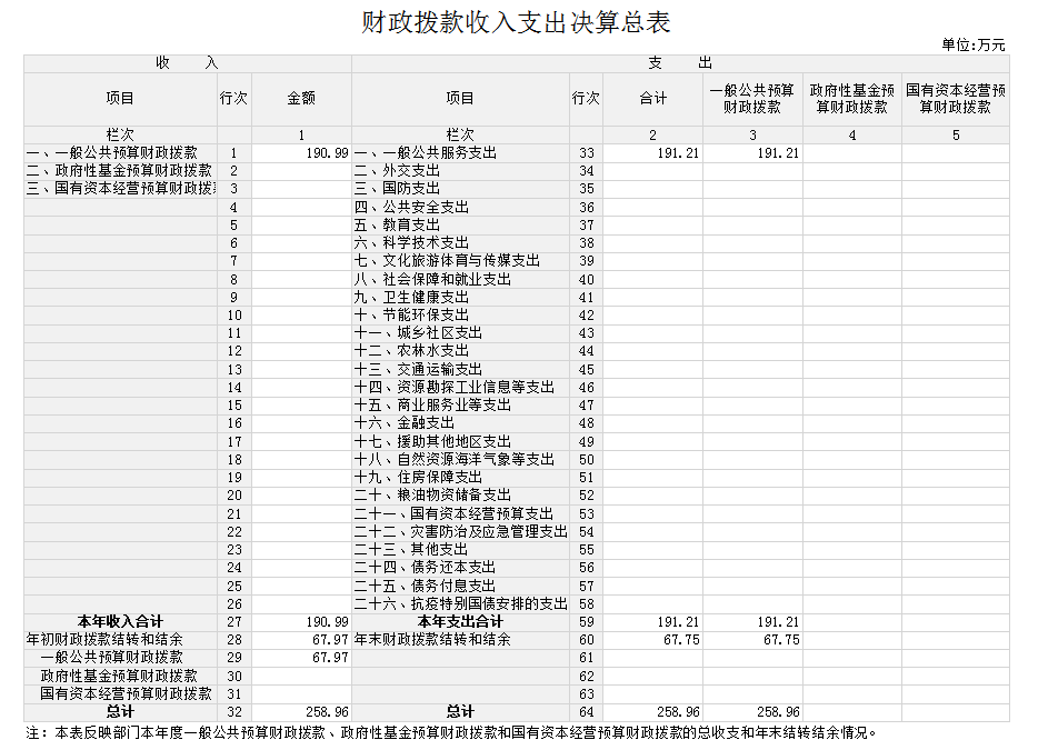 2024年度收入合计190.99万元,与2023年度相比,收入减少106.69万元,下降%。其中:财政拨款收入190.99万元,占本年收入100%;上级补助收入0万元,占本年收入0%;事业收入0万元,占本年收入0%;经营收入0万元,占本年收入0%;附属单位上缴收入0万元,占本年收入0%;其他收入0万元,占本年收入0%。