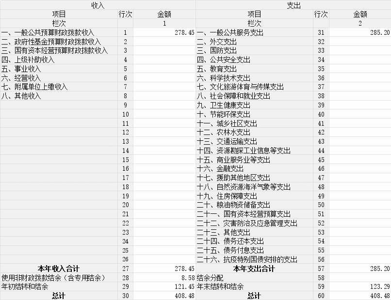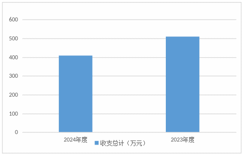 2024年度收、支总计均为408.48万元。与2023年度相比,收、支总计各减少101.06万元,减少19.83 %,主要原因是2024年有2个退休职工以及非财政拨款结转43.33万元由于报表统计口径的改变不包含在收支总计里面。