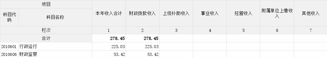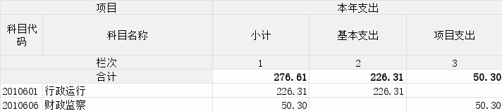 一般公共服务(类)支出276.61万元,占100%。主要是用于行政支出226.31万元和财政监察项目支出50.30万元。