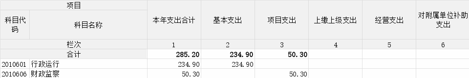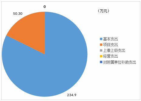 2024年度支出合计285.20 万元,与2023年度相比,支出合计减少50.99 万元,减少15.17 %,主要原因是2024年有2名职工退休和过紧日子要求控制财政监察项目经费缩减了15.7万元。其中:基本支出234.90万元,占本年支出82.36%;项目支出50.30万元,占本年支出17.64%;上缴上级支出0万元,占本年支出0%;经营支出0万元,占本年支出0%;对附属单位补助支出0 万元,占本年支出0%。