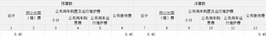 3.公务接待费支出决算为0.45万元,完成年初预算的100%,与年初预算数相等,主要原因是坚持过紧日子的要求,厉行节约严格控制公务接待支出。其中: