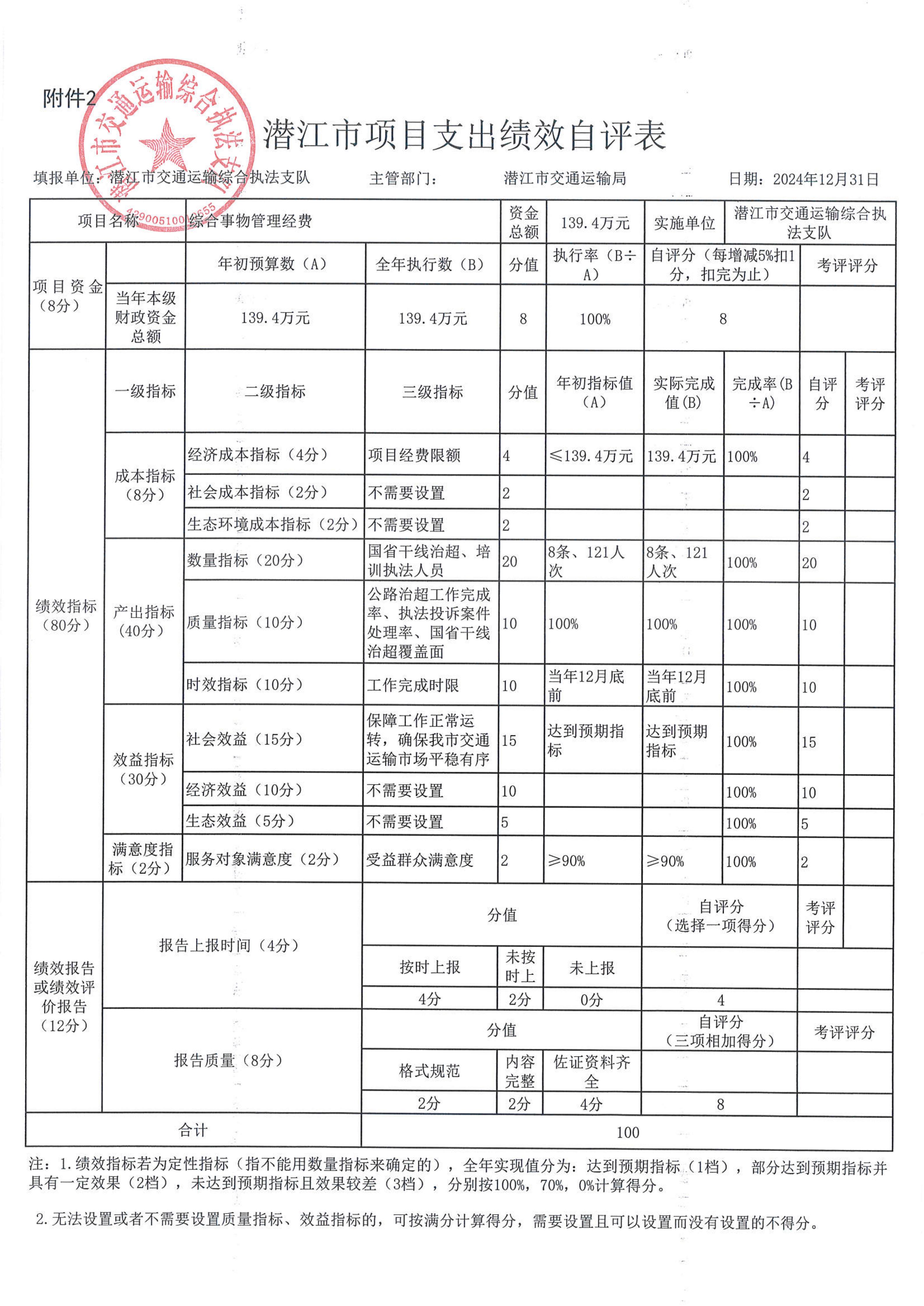 根据2023年度交通运输执法经费项目自评结果。2024年我支队认真执行项目预算,严格按2024年度综合管理经费项目支出绩效申报目标开展工作,无偏离情况,绩效显著。