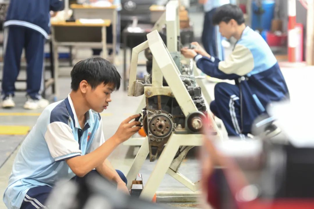 湖南永州工贸学校学生在参加汽车维修工等级认定实操考核。蒋克青 吴宴林 摄