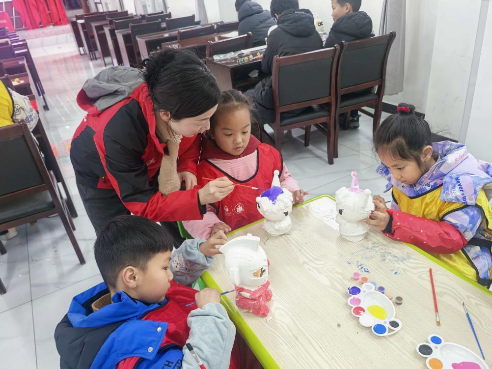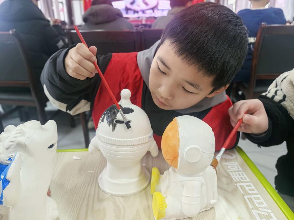 在吴妈妈的指导下,孩子们迫不及待地打开颜料,拿起画笔,化身“小小艺术家”。他们神情专注,或凝神构思,或大胆涂色,原本素白的陶瓷存钱罐,在孩子们的巧手下逐渐鲜活起来:有的画上了奔腾的骏马,象征着学习上一马当先;有的涂上了喜庆的红色,寓意着生活红红火火;还有的绘上了五彩的祥云,希望新学期能福气满满。虽然手法稚嫩,但每一笔都饱含着孩子们最纯真的心愿。