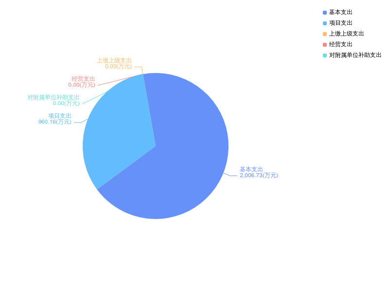 2024年度支出合计2966.89万元,与2023年度相比,支出合计减少3072.66万元,下降50.9%。其中:基本支出2006.73万元,占本年支出67.6%;项目支出960.16万元,占本年支出32.4%;上缴上级支出0.00万元,占本年支出0.0%;经营支出0.00万元,占本年支出0.0%;对附属单位补助支出0.00万元,占本年支出0.0%。