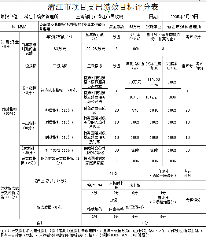 2024年免除城乡低保等特殊困难对象基本殡葬服务费用项目自评得分100分。