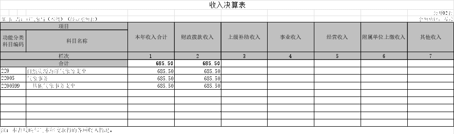 2022年度收入合计 685.5 万元。其中:财政拨款收入 685.5万元,占本年收入 100 %;上级补助收入 0 万元,占本年收入 0 %;事业收入 0 万元,占本年收入 0 %;经营收入 0 万元,占本年收入 0 %;其他收入 0 万元,占本年收入 0 %。