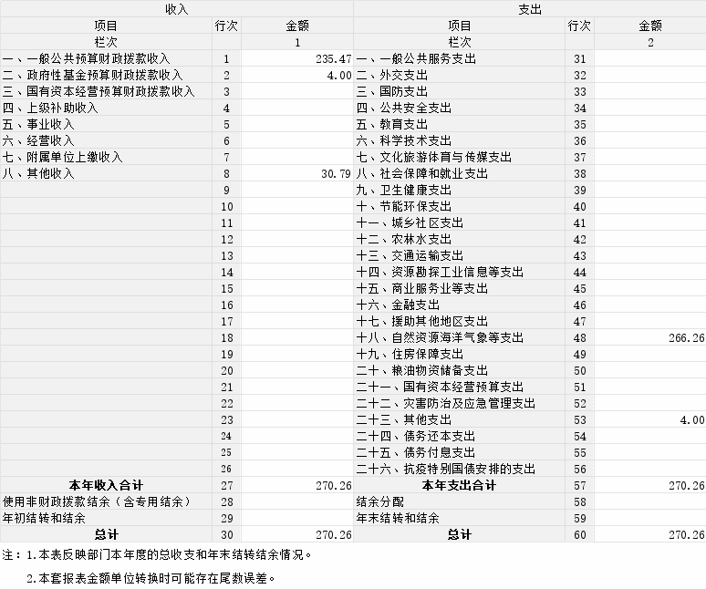 2024年度收、支总计均为270.26 万元。与2023年度相比,收、支总计各减少24.09万元,减少8.18 %,主要原因是减少了项目经费。