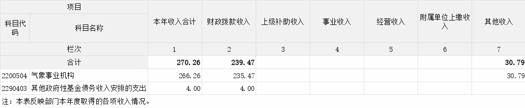 2024年度收入合计270.26万元。其中:财政拨款收入239.47 万元,占本年收入88.61%;上级补助收入0万元,占本年收入0%;事业收入0万元,占本年收入0%;经营收入0万元,占本年收入0%;其他收入30.79万元,占本年收入11.39%。