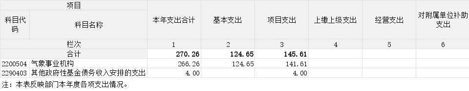 2024年度支出合计270.26万元。其中:基本支出124.65万元,占本年支出46.12%;项目支出145.61万元,占本年支出53.88 %;上缴上级支出0万元,占本年支出0%;经营支出0万元,占本年支出0%。