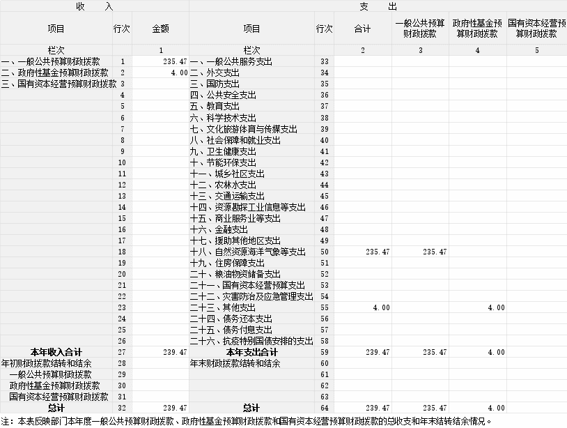 2024年度一般公共预算财政拨款支出年初预算为万元,支出决算为239.47万元,完成年初预算的100%。其中:自然资源海洋气象支出(类)。年初预算为万元,支出决算为239.47万元,完成年初预算的100%,