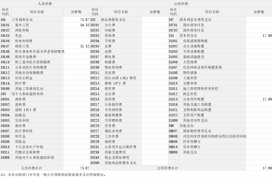 公用经费17.99万元,主要包括:办公费、印刷费、咨询费、手续费、水费、电费、邮电费、取暖费、物业管理费、差旅费、因公出国(境)费用、维修(护)费、租赁费、会议费、培训费、公务接待费、专用材料费、被装购置费、专用燃料费、劳务费、委托业务费、工会经费、福利费、公务用车运行维护费、其他交通费用、税金及附加费用、其他商品和服务支出、办公设备购置、专用设备购置、信息网络及软件购置更新、公务用车购置、其他资本性支出。