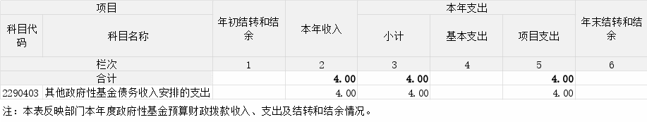 2024年度政府性基金预算财政拨款年初结转和结余万元,本年收入4万元,本年支出4万元,年末结转和结余0万元。本单位当年无政府性基金预算财政拨款收入支出。