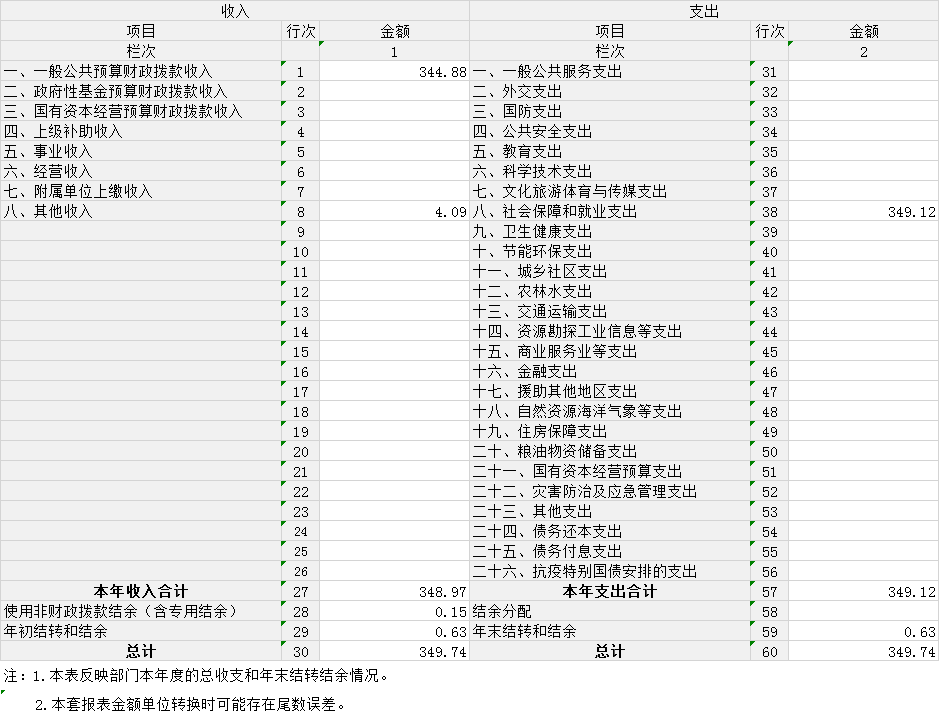 2024年度收、支总计均为349.74万元。与2023年度相比,收、支总计各减少66.84万元,减少16.04%,主要原因是2024年财政拨款减少。