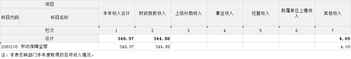 1.社会保障和就业支出(类)人力资源和社会保障管理事务(款)劳动保障监察(项)。年初预算为349.36万元,支出决算为344.88万元,完成年初预算的98.72%。