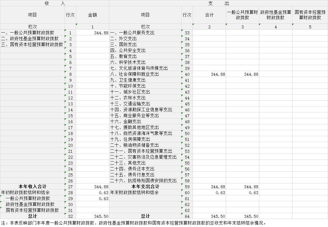 2024年度财政拨款收、支总计均为345.5万元。与2023年度相比,财政拨款收、支总计各减少22.07万元,减少6%。主要原因是2024年财政拨款减少。