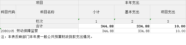 1.劳动保障监察支出344.88万元,占100%。主要是用于劳动保障监察基本支出和项目支出。