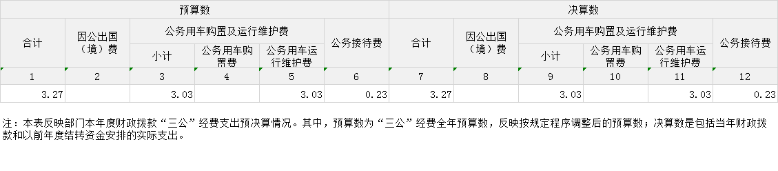 2024年度“三公”经费财政拨款支出预算为4.29万元,支出决算为3.27万元,完成预算的76.22%。较上年减少0.16万元,减少4.66%。决算数较上年减少和决算数小于预算数的主要原因:严格落实中央八项规定、省委六条意见和厉行节约,控制“三公”经费开支。